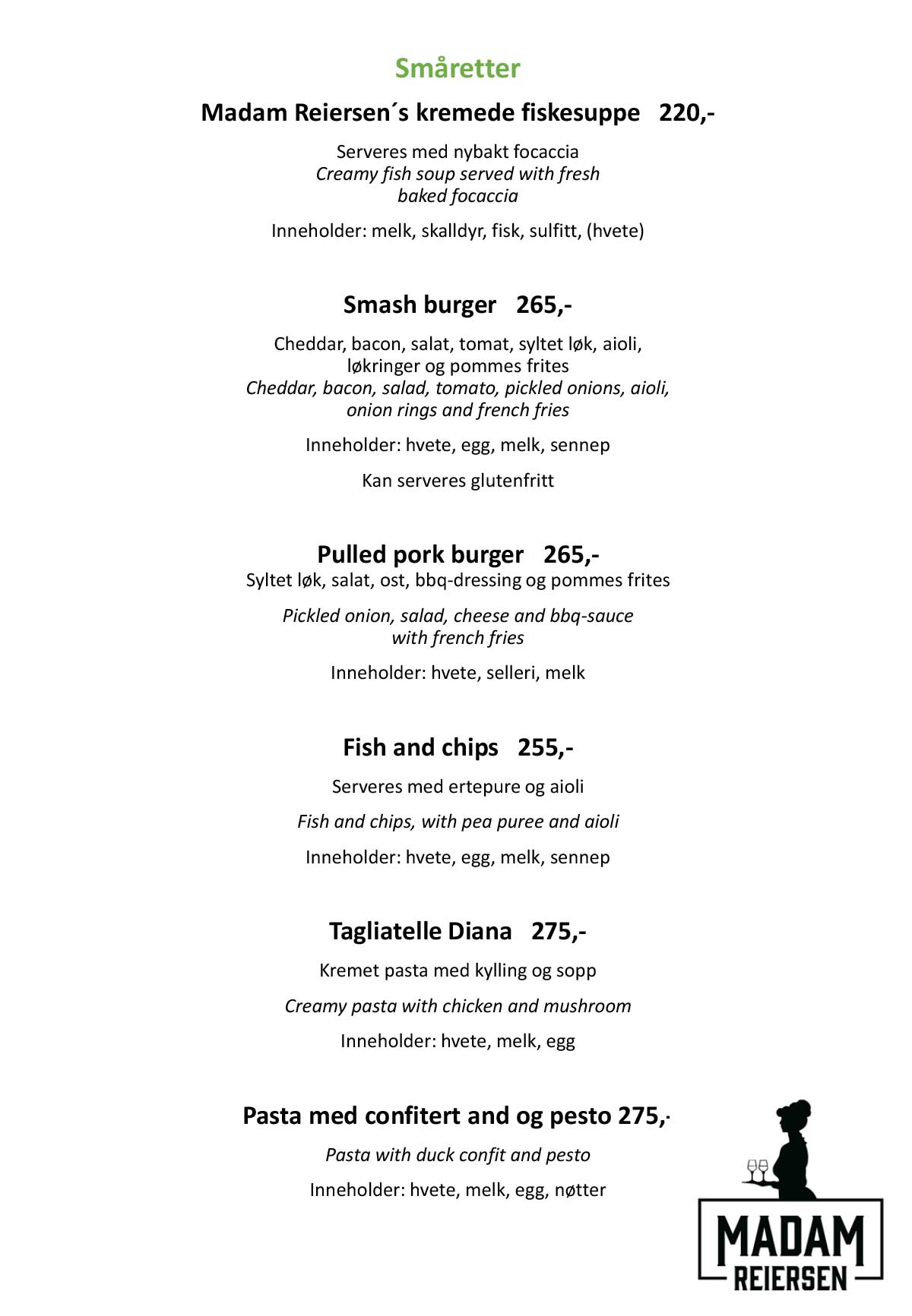 Velkommen til vår restaurant! Utforsk våre smakfulle menyer med deilige lunsjretter, delikate småretter, utsøkte hovedretter og fristende desserter. Prøv vår kremede fiskesuppe, smash burger eller skinnstekt havabbor, og avslutt med en herlig ostekake eller gateau Marcel.